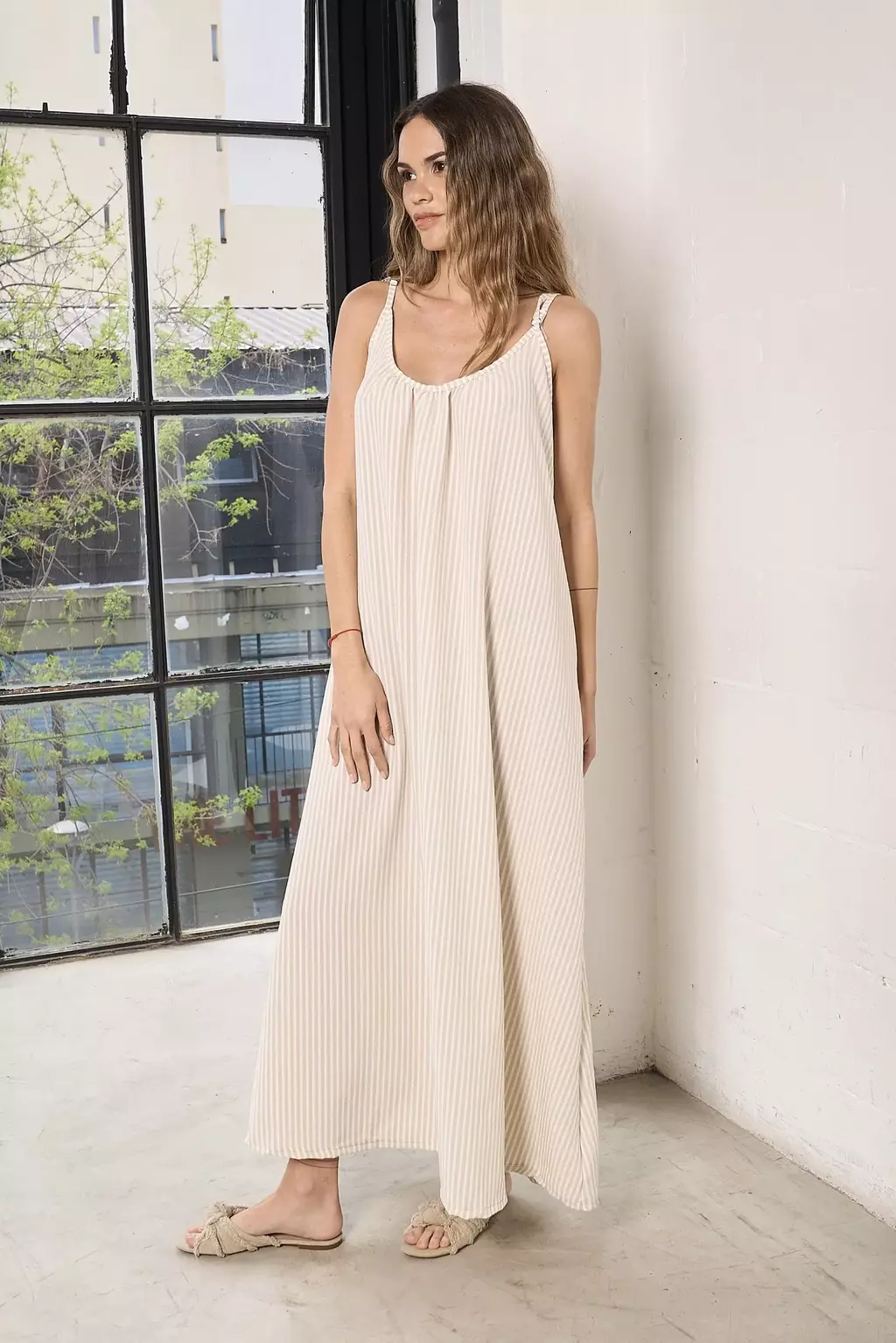 Vestido confeccionado en lino retier, modelo amplio con breteles regulables escote profundo en espalda.