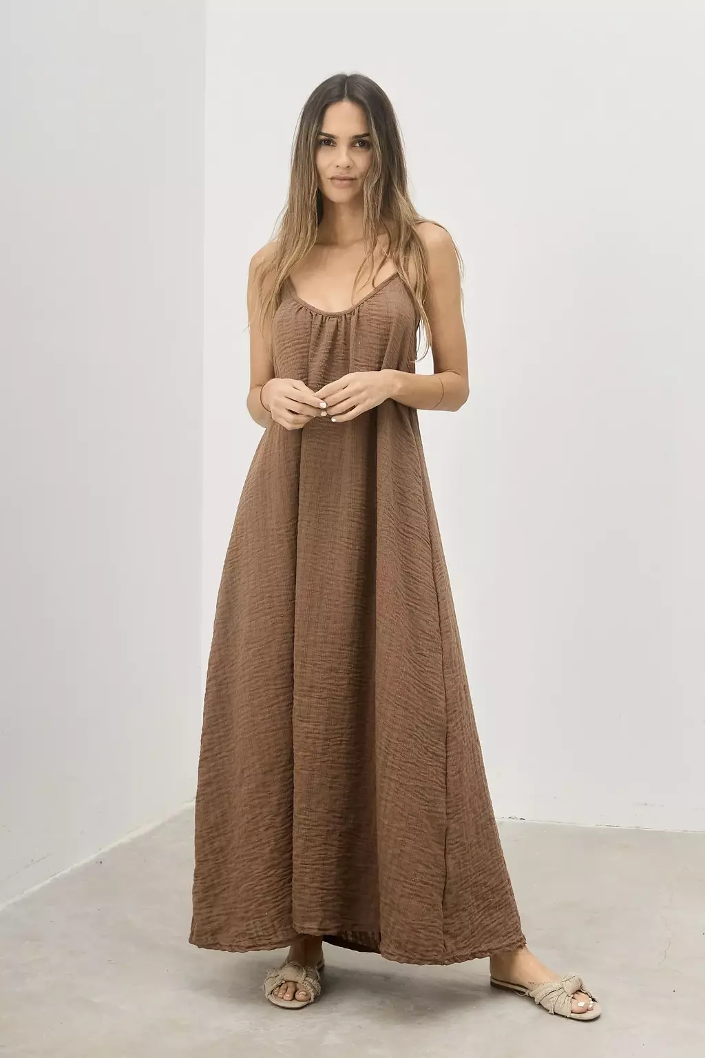 Vestido confeccionado en lino retier, modelo amplio con breteles regulables escote profundo en espalda.